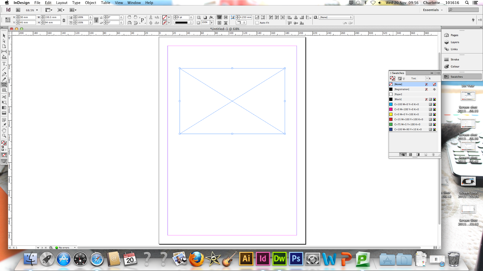 Using a Swatches palette gives you consistency throughout your work in regards to colour application. Despite this, it is presented differently to that in Illustrator: Illustrator has lots of different swatch colours with little information whereas InDesign has just 7 Colours which makes it more practical to work with. They are named by the Colour Ink Mixtures showing how the colours are considered as Inks. Making a New Colour Swatch bring ups a Swatch Dialogue Bow where you can make a new mixture.